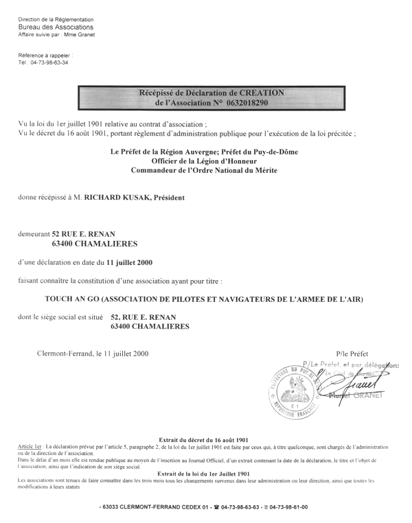 Il est fondé entre les adhérents aux présents statuts une association, régie par la loi du 1er juillet 1901 et le décret du 16 août 1901, ayant pour titre « Touch and Go ».